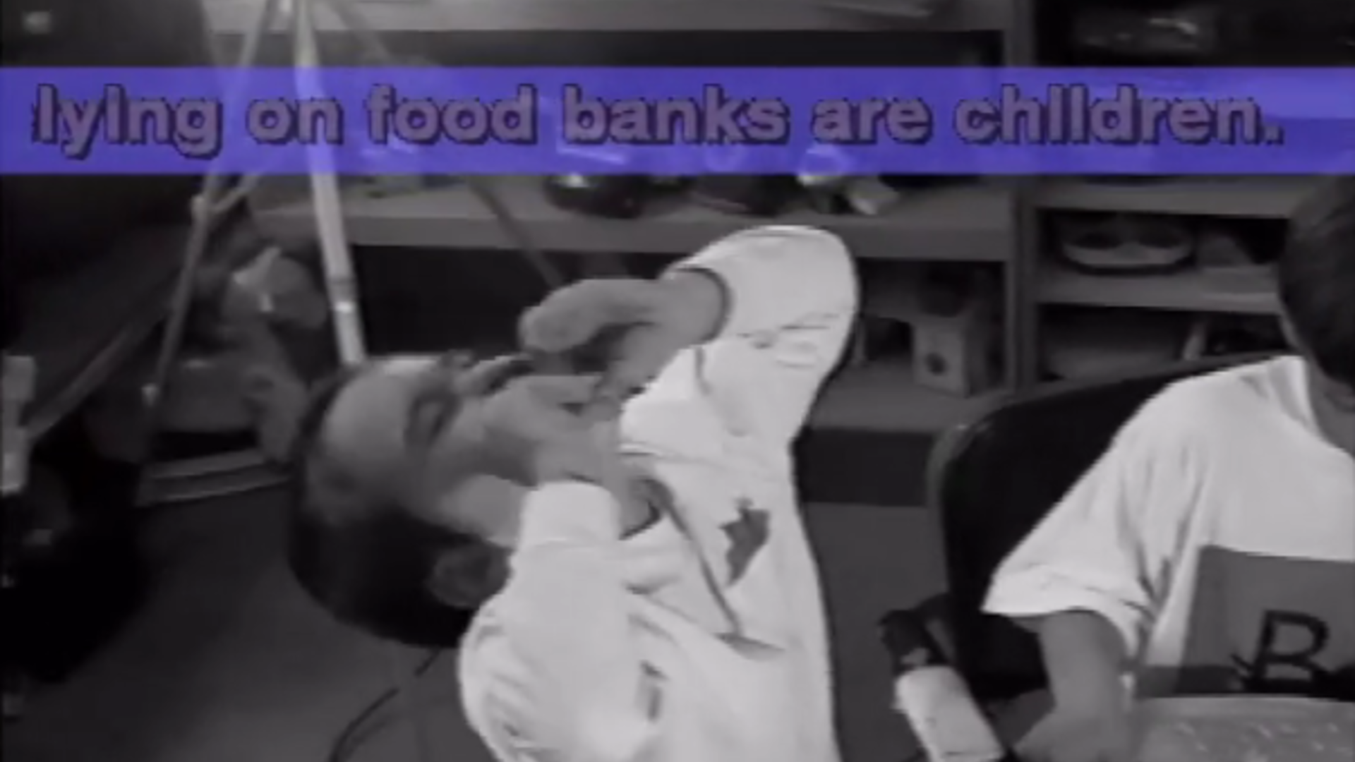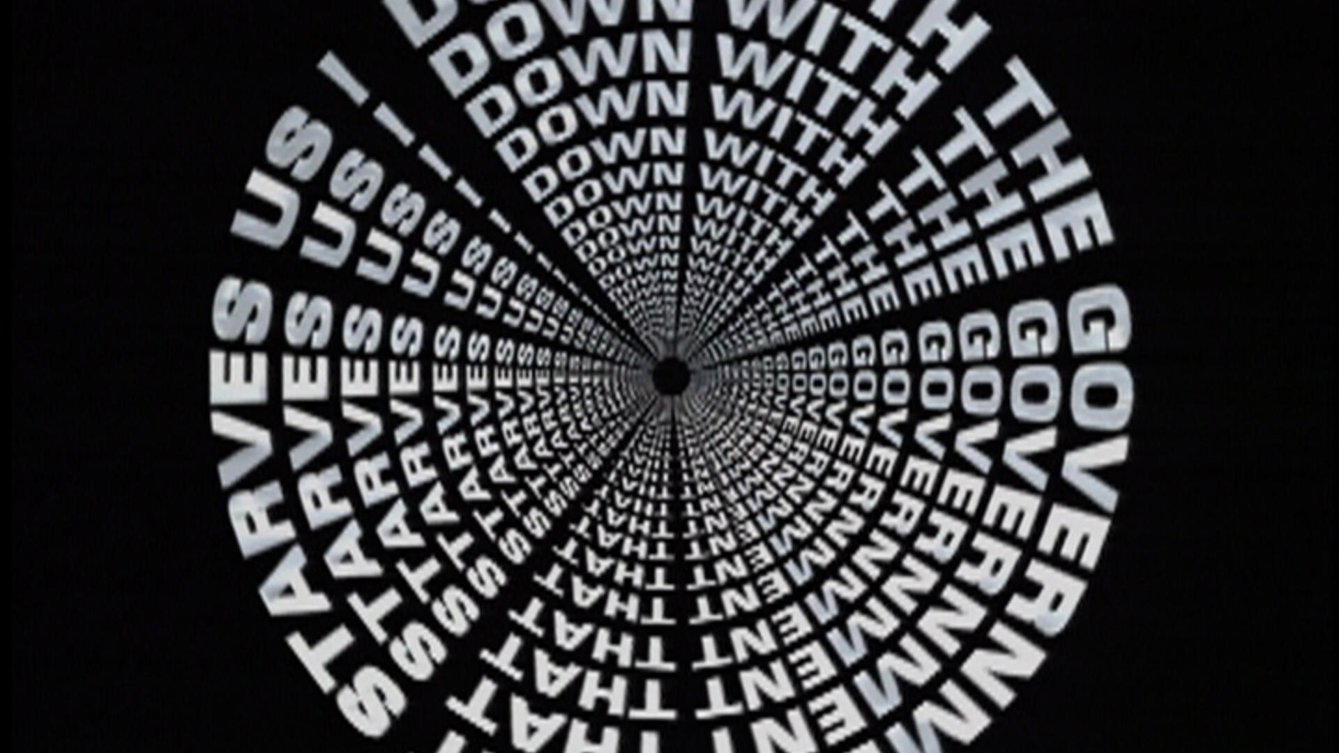 A lampoon against the poverty caused by the capitalism of democratic institutions, not least that of city kids from poor backgrounds. Repeating a protest slogan like a mantra, Kantor builds a formal lexicon combining layered graphics, 3D animation, performance, and text, and plays with the hypnotic effects of text transposed onto image.