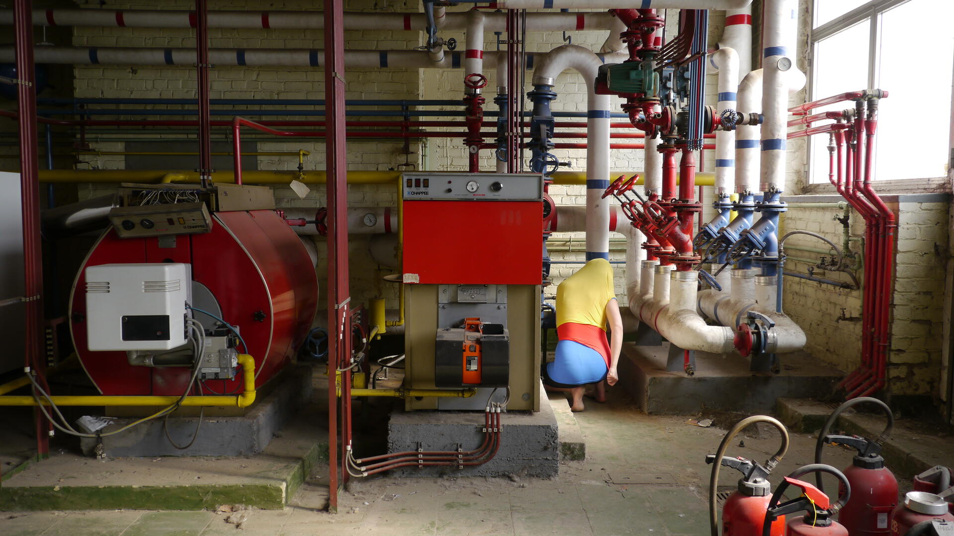 Hundreds of still photographs of a figure moving within an unusual interior. The solitary figure melds into the colour coded pipes and machinery as the light streams into this basement room in a manner that is reminiscent of a 17th century Dutch interior painting.