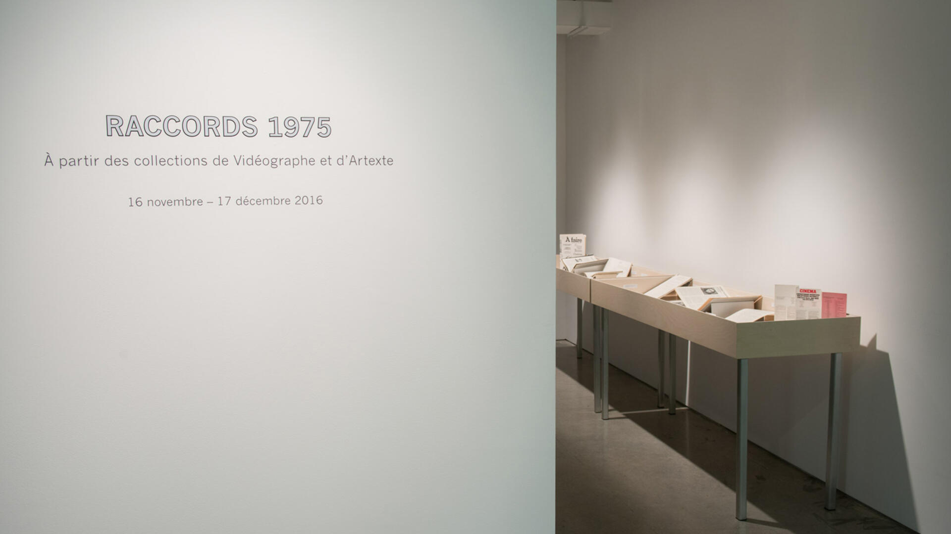 RACCORDS 1975 : À partir des collections de Vidéographe et d’Artexte \ MATCH CUTS 1975: From the Collections of Vidéographe and Artexte, presented at Artexte from November 16 to December 17, 2016, was a call-and-response conversation between two collections. The exhibition presented a new video created from Vidéographe sources, and ephemeral documents, catalogues, monographs, and critical texts from Artexte’s holdings. This first collaborative and experimental assemblage of video and print documents took 1975 as a juncture around which the role and value of the art institution and the artist were re-examined and redefined. Together, the video and print documents revealed a push to recast the public’s relationship with the art institution and the artist. Actions, words and voices fundamental to the discourse and debates, were the points of contact linking the documents produced around this catalytic time.