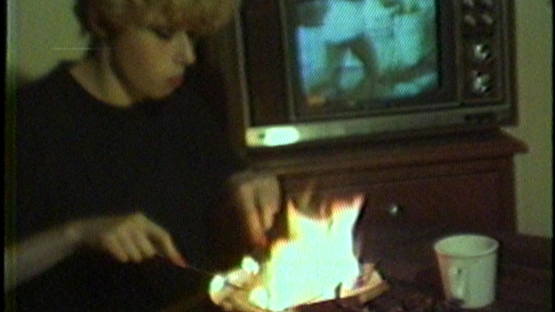Nine Silent tapes, each between four and eight minutes long, intended to be screened on a loop in late night establishments. The first three videos are portraits of women. Maria is eating in front of the television when a hand engulfed in flames appears and burns her meal. Daily routine is interrupted by danger and desire.