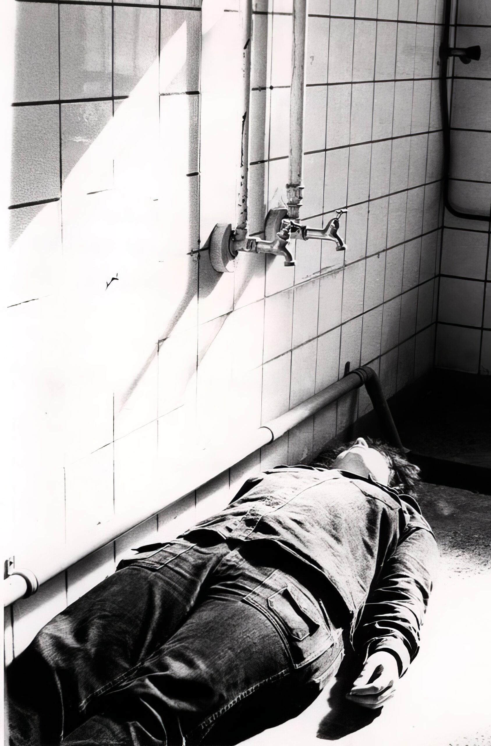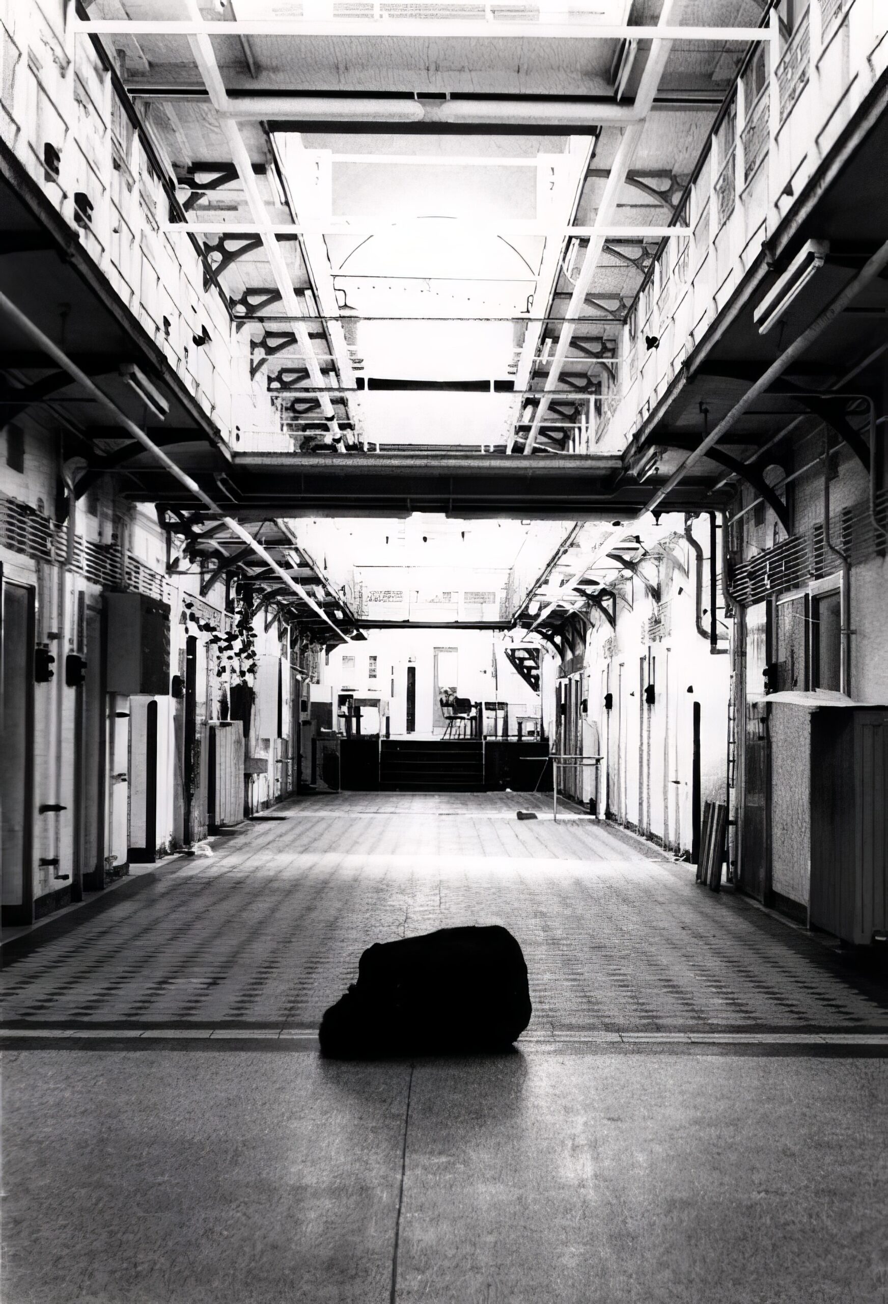 De tels rapports de mouvement et de repos, ces affects auxquels réfèrent Deleuze et Guattari, un observateur attentif les repèrera rapidement chez marshalore. Déroutants, singuliers, ils ont ébranlé et continuent de perturber plus d’un spectateur. La proposition de l’artiste est claire, directe, crue, sans flafla. L’artiste invite à regarder, à penser : invitation à la fois critique, ironique et cabotine. Ses photographies, vidéos, installations, performances révèlent une tension, perceptible dans la manière dont le temps ralentit, s’arrête, pour laisser place au présent de chaque action, que celle-ci soit racontée, commentée ou vécue, voire exécutée sous nos yeux. Dans chaque œuvre, un corps porte le récit et l’inscrit dans un espace donné, cristallisant la pensée, le regard critique et politique derrière l’action. À cet égard, deux photographies – documents d’une action réalisée en 1979 par marshalore durant trois jours dans une prison abandonnée d’Amsterdam avec un appareil photo, un trépied et une minuterie – méritent qu’on s’y attarde, car elles recèlent plusieurs éléments emblématiques de son œuvre.